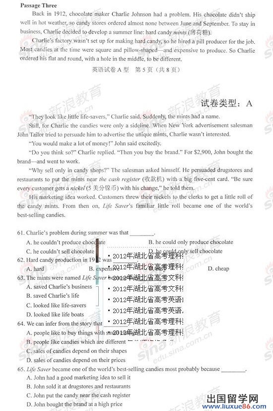 2012高考试题及答案:湖北省高考考试英语(A卷)