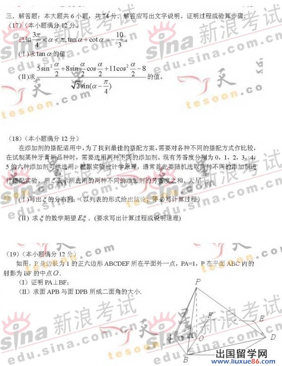安徽2006高考数学理真题和参考答案