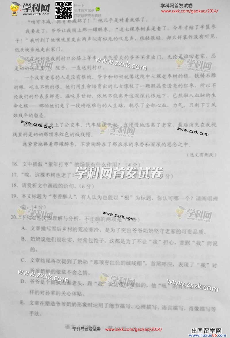 2014年天津语文试题官方发布