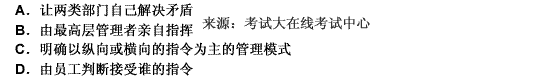 18、在实际运行中发现,如果由于公司职能部门与项目部门之间的指令发生矛盾,影响了这个组织的系统的运行效率。公司对此宜选择的做法是( )。
