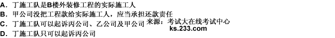 58、甲公司把A、B两栋楼工程发包给乙公司施工,乙公司私下把8楼的施工任务转包给丙公司,丙公司又把B楼的外装修工程分包给丁施工队完成。工程完工后甲公司付清了乙公司工程款,但是丁施工队没有拿到工程款,准备起诉。下面的说法中,不正确的是( )。