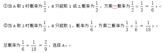 (标准)两个不透明的布袋A和B里面各放着6个球。其中,布袋A中的球有3个标为数字1,2个标为数字2,1个标为数字3;而布袋B中的球分别标为1、2、3、4、5、6,若某人分别从布袋A和B里取出一个球,问这两个球的数字之和不大于3的概率是多少?