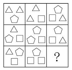 正确答案是 A, 来源国家3000考点解析在九宫格中,从整体的角度观察,题干8个图形中,三角形的数量一共为8个,正方形的数量一共为8个,五边形的数量一共为8个,三种元素数量一样,为使这一规律得以延续,因此本题选择A选项,使得题干每种元素数量都为9。